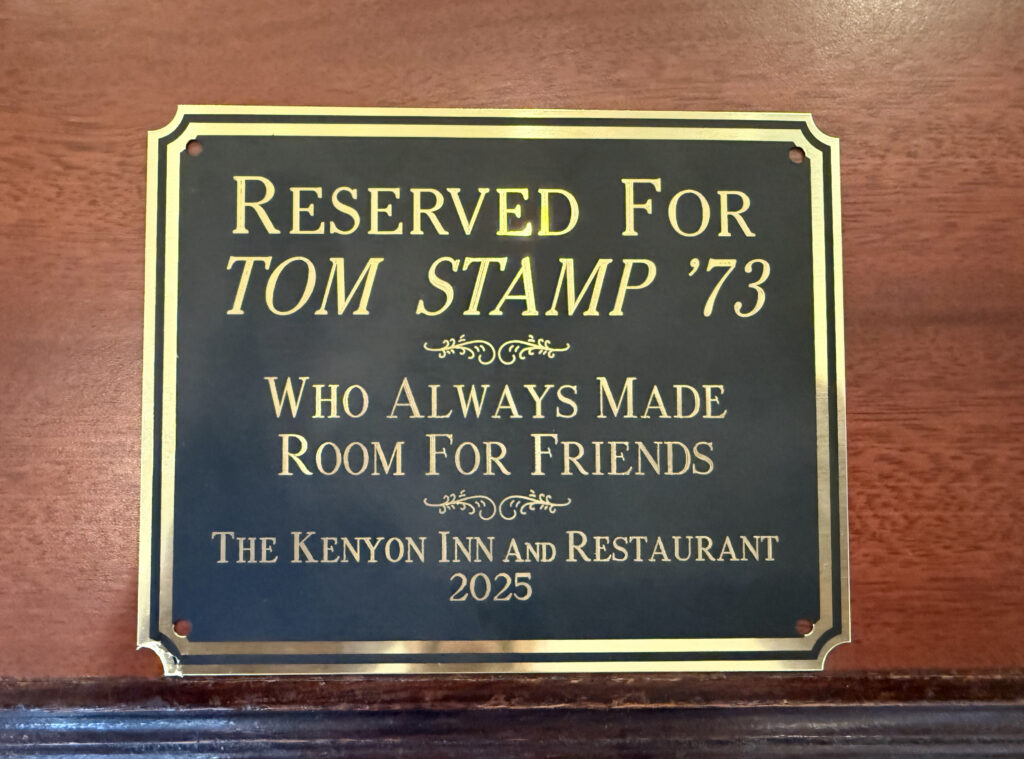 The Kenyon Inn recently dedicated the dining room’s back corner table (by the kitchen door) in Tom’s honor. This was his much preferred location due to dining room chatter, etc., and the site of many wonderful conversations. Here’s hoping you might dine at Tom’s Table soon and toast his good memory.